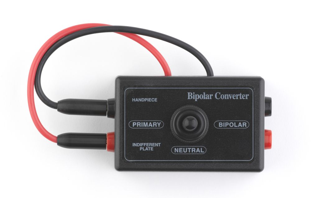 Bipolar converter for ART-Electron™ (E1). Permits the usage of bipolar prongs and handpieces. Bipolar prongs and handpiece not included.